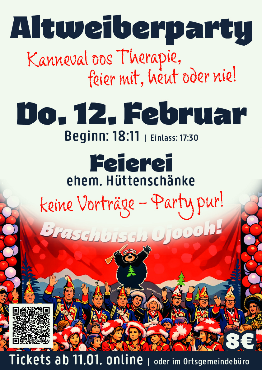 Genau wie schon im letzten Jahr steht diesmal wieder Kneipenkarneval pur auf dem Programm! Wir sparen uns sämtliche Vorträge und fe(i)uern von Beginn an einen Hit nach dem anderen ab - bis nix mehr geht, denn: Kanneval oos Therapie - feier mit, heut' oder nie! Natürlich gibt sich auch das Dreigestirn die Ehre und ist dabei! Neben jeder Menge Karnevalsmusik erwartet euch iihskaahles Erzi und andere leckere Erfrischungsgetränke. Verhungern muss natürlich auch keiner. Und, ganz wichtig: natürlich durwen Kerle uch rönn - obwohl dat jo Altweiber ös! Mir freuen oos alt uff üsch - Braschbisch Ojooh!